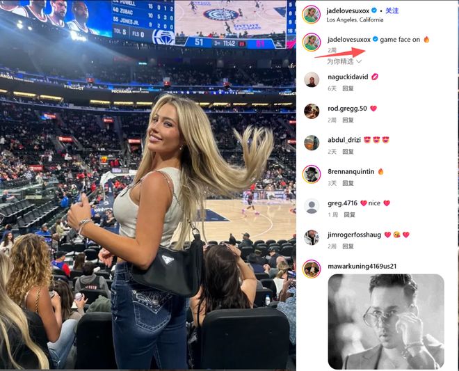 在此前,快船以110-114不敌独行侠的比赛中,Jadelyn买了场边VIP区域的票来观看主队的比赛,只可惜,快船在领先两位数的情况下,在下半场进攻火力表现糟糕得情况下,最终输球。