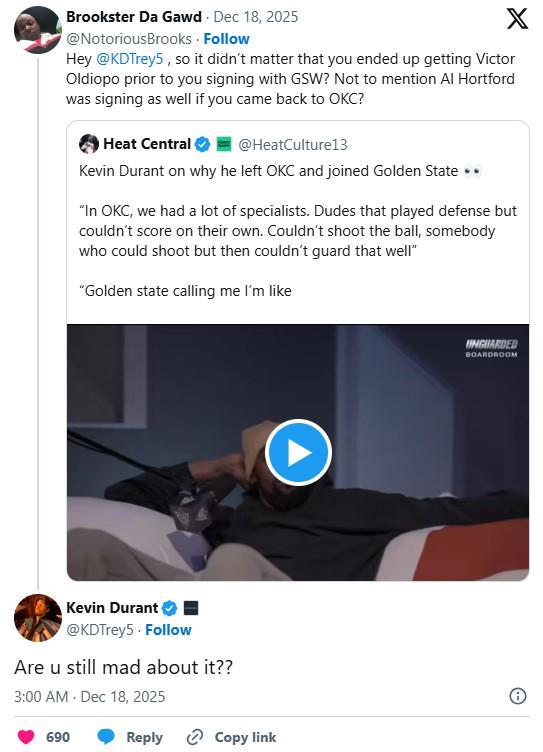 另一位球迷提到了杜兰特2016年离开俄克拉荷马城雷霆队加盟金州勇士队的事件,他表示难道奥拉迪波和霍福德的加盟还不能让他留在雷霆而不去勇士吗,杜兰特再次以嘲讽的方式回复:“你还耿耿于怀吗?”