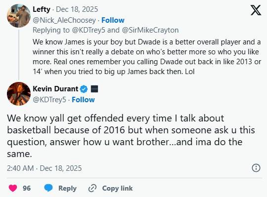 随后还有一名网友说道:“我们知道詹姆斯(哈登)是你的哥们儿,但韦德是一位更全面的球员,也是一位真正的赢家。这其实不是在争论谁更强,而是你更喜欢谁的问题。真正了解你的人都记得你在2013年或2014年左右就曾批评过韦德,当时你还试图吹捧哈登。哈哈。”杜兰特则回复道:“我知道每次我谈到篮球你们都会生气,因为2016年(加盟勇士)的事情,但当有人问你这个问题时,你想怎么回答就怎么回答,兄弟……我也会这么做。”